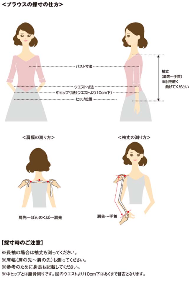 - 2)下着または肌着の上から「バスト」「ウエスト」「中ヒップ」「肩幅」を測ります(実寸法)。